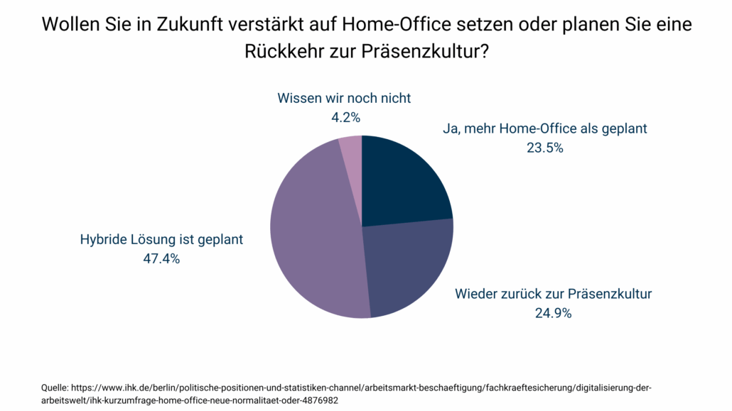 Dabei gaben 47,4% der Befragten an, eine hybride Lösung zu planen, um beide Arbeitsformen zu kombinieren. Bei vielen der Unternehmen sind sogar schon konkrete Maßnahmen entstanden. 23,5% haben sich für den Wechsel zum dauerhaften Homeoffice entschieden, während 24,9 % wieder zurück zur alten Präsenzkultur wollen.