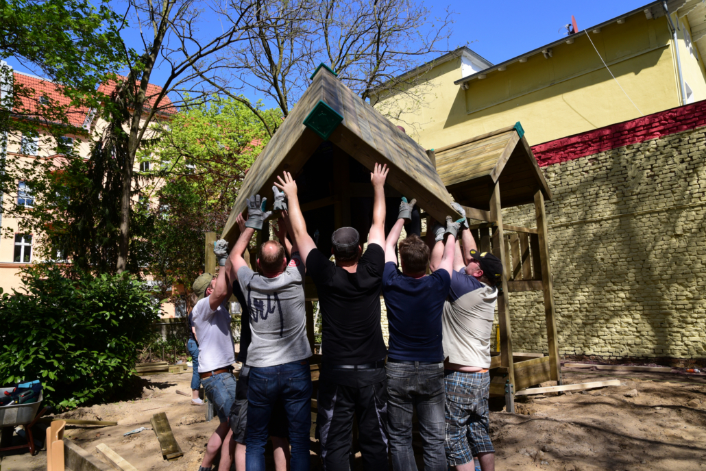 Es wurden zunächst alte Klettergeräte abgebaut und nicht mehr nötige Fundamente mit Hämmern und großem Krafteinsatz beseitigt. Dann ein tolles neues Holz-Klettergerüst mit Türmen und einer Rutsche, eine neue Schaukel sowie Sitzbänke ebenfalls aus Holz aufgebaut. Zu allen neuen Geräten wurden wieder Fundamente gegossen, damit die Kinder hier auch künftig sicher und stabil spielen können. Die erbauten Klettertürme stehen nun fest in einem, mit frischem Sand gefüllten, Sandkasten. Das bereits vorhandene Gartenhaus wurde abgeschliffen und gestrichen und das Dach bekam neue Schindeln. Jetzt ist alles wieder dicht und erstrahlt in vollem Glanz.