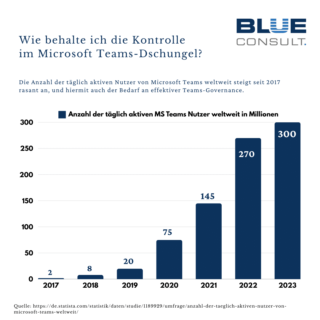 Viele Unternehmen nutzen mittlerweile Microsoft 365 und somit auch Applikationen wie Microsoft Teams. Microsoft Teams hat weltweit über 320 Millionen monatlich aktive Benutzer erreicht, was es zu einer der am weitesten verbreiteten Kollaborationsplattformen macht. Microsoft Teams ermöglicht eine einfache und schnelle Kommunikation und Zusammenarbeit, was sicher auch dazu geführt hat, dass es sich rasend schnell zu einer führenden Plattform etabliert hat. Pandemie und die Schnelligkeit der Digitalisierungswelle haben die IT-Abteilungen, meist in Eigenverantwortung, dazu gebracht, Teams im Unternehmen einzuführen. Allein in Deutschland nutzen etwa 285.000 Unternehmen Microsoft Teams als ihre primäre Plattform für Kommunikation und Zusammenarbeit.