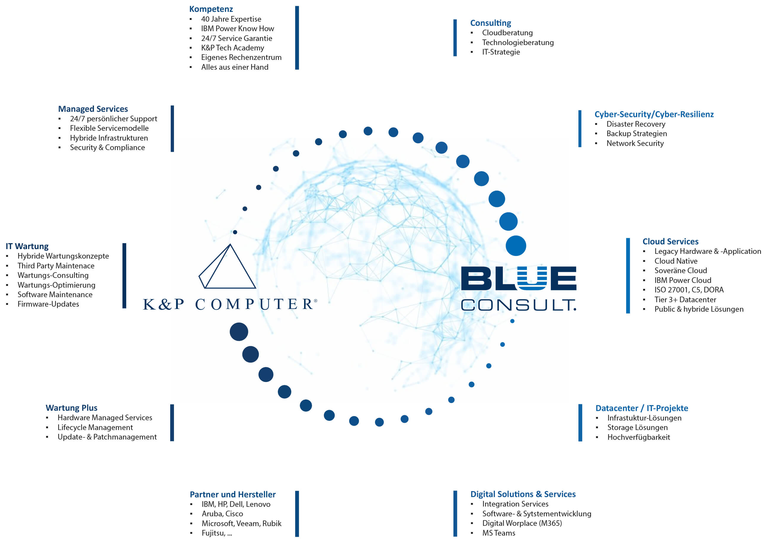Hier sehen Sie einen Überblick unseres Leistungsangebotes, das Hand in Hand mit dem Portfolio der K&P Computer geht.
